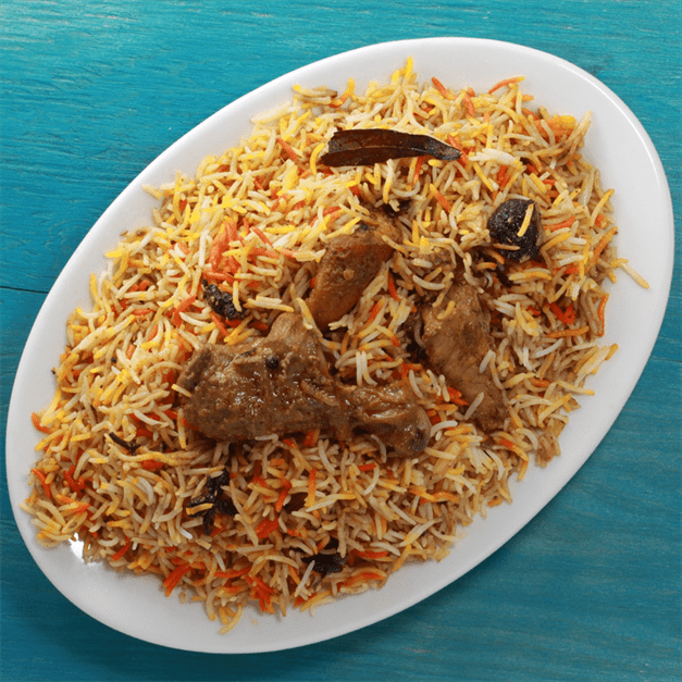 Tender lamb shank baked under traditionally seasoned browned rice with sweetened carrots and raisins.
